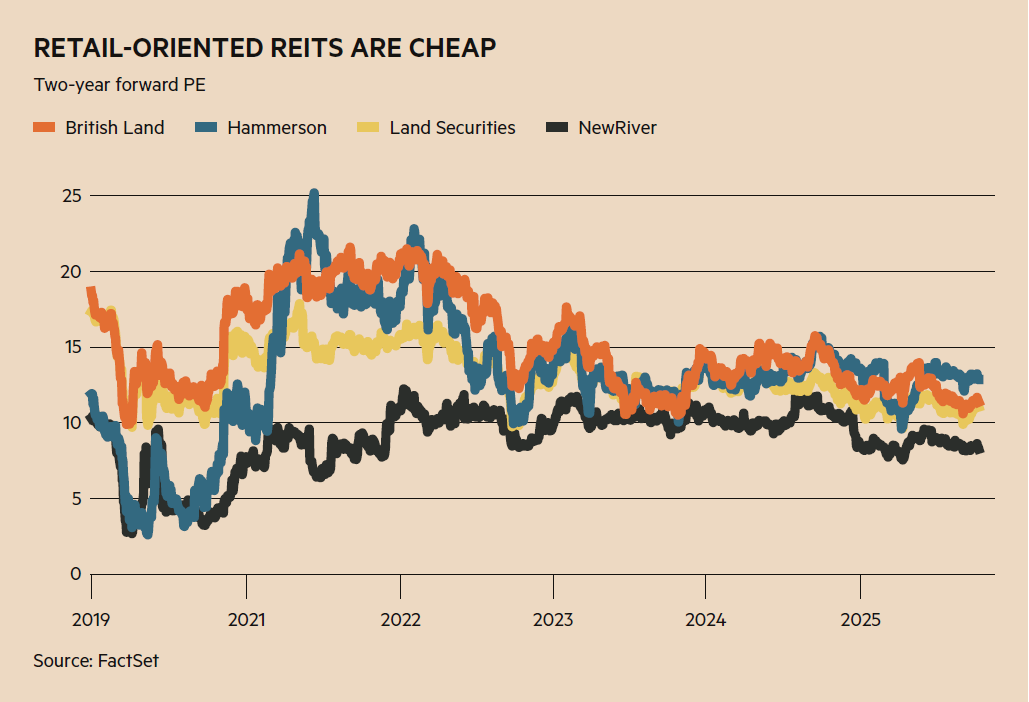 The high street has generally fared worse than shopping centres, except in the best locations, where rents and values have risen consistently. The premium valuation of Shaftesbury (SHC), which owns swaths of London’s West End, reflects this.