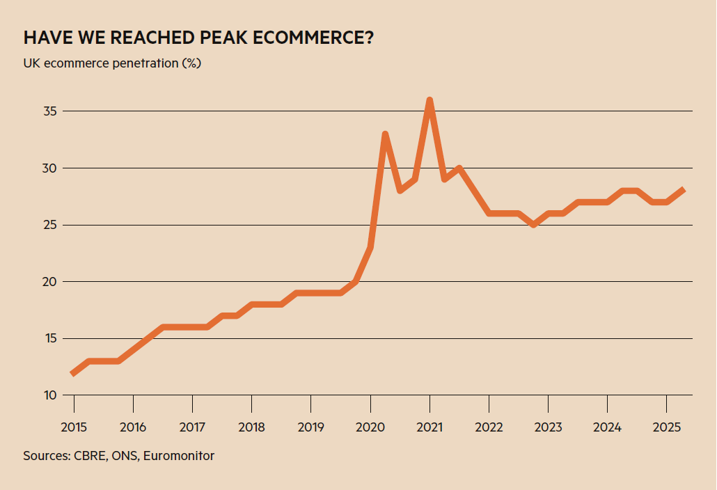 This varied by category, with consumers more comfortable buying their clothes online than their groceries. Yet ecommerce penetration has slowed since spiking during the pandemic, leading to speculation that it is peaking in the UK. “The UK has one of the highest penetrations in the world. We feel it is plateauing,” says Mark Garmon-Jones of Savills. “The disruption has taken place,” opines Bjorn Zietsman, analyst at Panmure Liberum.