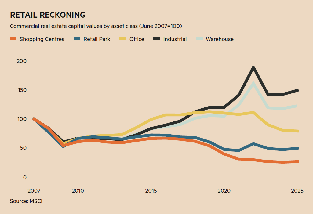 To say it has been a tricky couple of decades for retail real estate would be an understatement. The triple whammy of the financial crisis, the rise of ecommerce and the pandemic have caused capital values to fall by 50-75 per cent since 2007, according to data from MSCI, while retail park and shopping centre rents remain stubbornly below pre-crisis levels, even in prime locations.